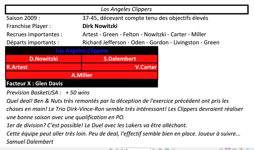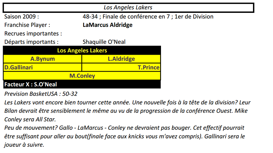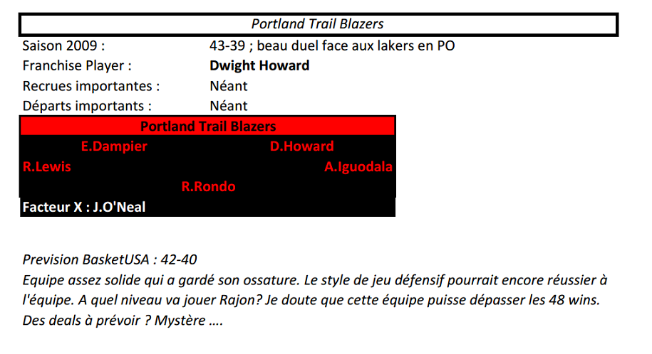 Pour ce qui est de la division, je pense que la div.Pacifique est la plus relevée de la Ligue. Les Lakers sont toujours aussi fort malgré le depart du Shaq. Les Blazers devrait facilement aller en PO tout comme nous. On pourra également voir le renouveau des Clipps avec l’arrivé des Carter,Dirk ou Dede Miller,il devrait facilement accéder en Play off, en théorie.Ensuite, les Kings, c’est sexy avec leur jeune star tel que Harden/Love et Lopez et encadré par des très bon joueur comme Tmac, Ford et surtout Gino. Les Kings peuvent jouer les troublemaker ! Les Warriors j’ai du mal à y croire meme si l’arrivé de Iverson est encourageant,les Sonics sont souvent décevants, a voir si SAR peut porter l’equipe.