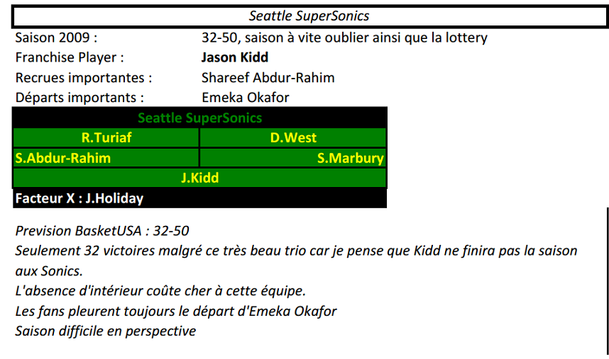 « Pour le fun », voila pourquoi Rémy a échangé Okafor contre SAR. Les Sonics possèdent une ligne extérieur haute gamme et des intérieurs dramatique. Rémy a donc le cul entre 2 chaises. Une rumeur annonce que des deals se préparent afin de récupérer du cap. Nous connaîtrons donc la vraie gueule des Sonics dans quelques jours!