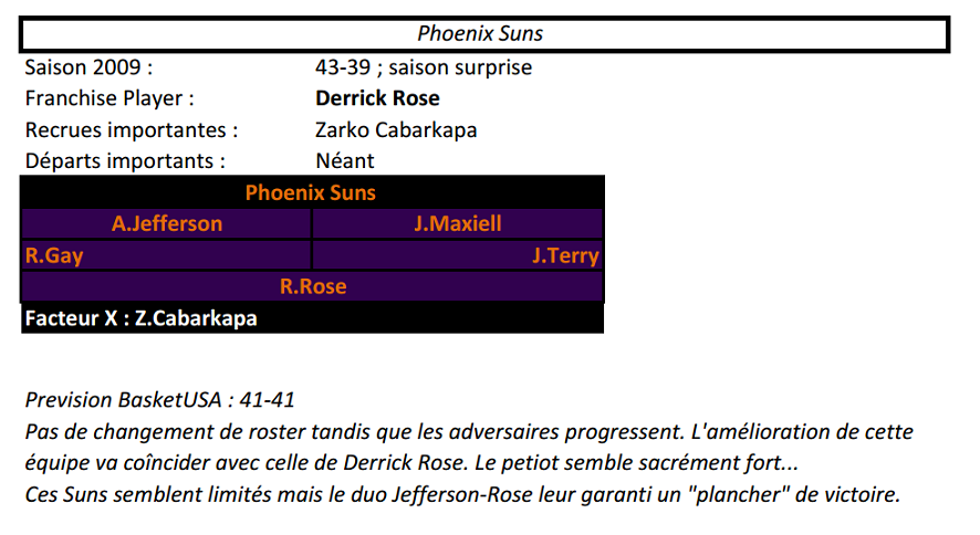 Rose et Al Jefferson ne bougeront pas. Pareil pour Maxiell, on doute que des equipes viennent nous faire des offres et nous ne sommes pas vendeur vu sa complémentarité avec Jefferson et son ridicule salaire. Nous écoutons toute offre pour Rudy Gay, Thaddeus Young et Jet Terry. Danny Green ne devrait pas partir.