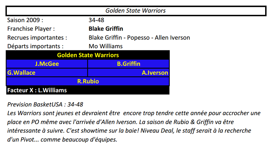 « Golden State est en pleine periode de transition, Curryo partant à la retraite , il m’apprend les ficelles du métier et nous tentons d’assainir les finances afin d’envisager le futur plus sereinement. Une transition faite en douceur, et bien accompagnée par l’arrivée de Blake Griffin qui, on l’espere, fera l’histoire de la franchise. L’effectif est jeune, et Gerald Wallace fait office de veteran du haut de ses 27 ans. Nous estimons aussi que l’équipe manquait de scoring, c’est pourquoi nous avons fait venir Iverson de Dallas contre Mo Williams, qui avec l’arrivée du prodige espagnol, n’entrait plus dans nos plans. Son contrat peut s’averer etre un contrat boulet, compte tenu de son âge mais nous avons seulement Gerald Wallace et Nelson a eventuellement ressigner dans les trois prochaines années, de plus nous avons suffisamment de contrats rookies.