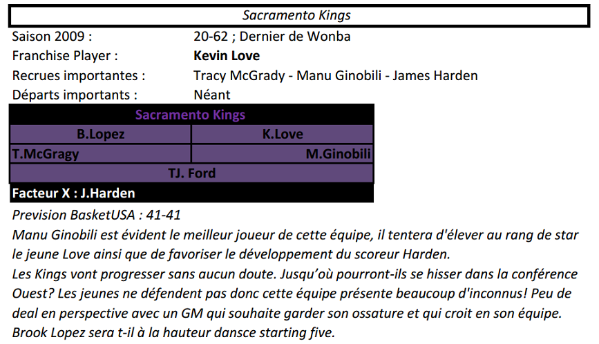 Ça démarre à Sacramento !!!!!! T-mac puis Harden et enfin Ginobili, intersaison très satisfaisante!! Equipe à la fois jeune et avec 2 bons vétéran. La grosse interrogation est la défense, notra attaque arrivera t-elle à compenser nos carences ?